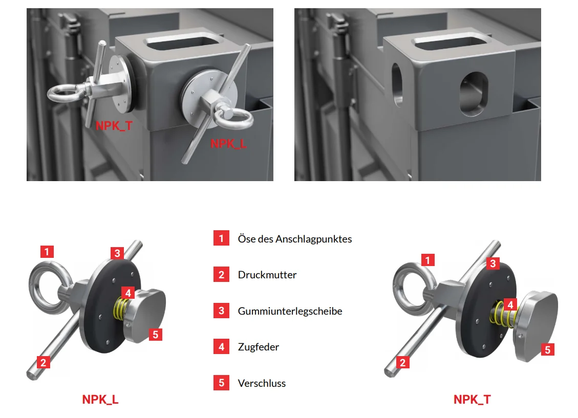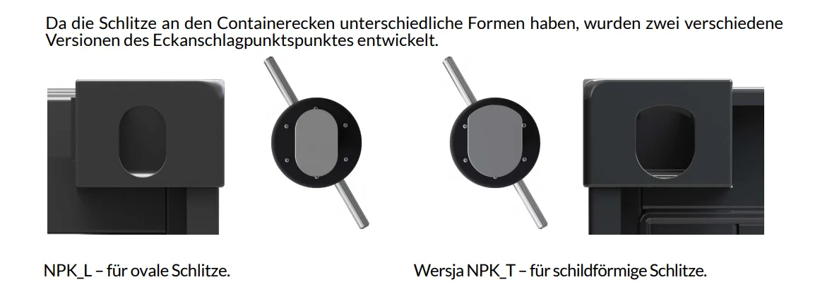 Die Eckanschlagpunkte sind in zwei Versionen erhältlich: NPK_L und NPK_T. Die Anschlagpunkte sind für die Montage in die Transportschlitzen an den Ecken eines Containers gedacht.