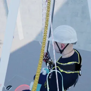 Escalade avec assurage sur une tour de soutien d’une construction en treillis