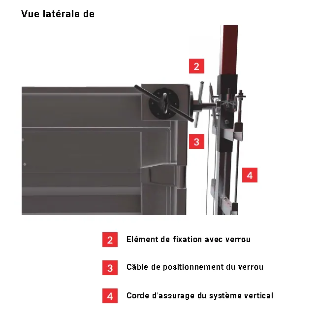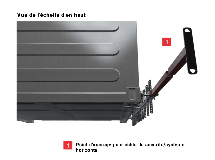 L’échelle supérieure utilisée au dernier étage se termine par un poteau d’entrée servant de point d’ancrage pour une ligne de sécurité ou une corde d’ancrage horizontale permettant de rester en toute sécurité sur le toit du conteneur.
