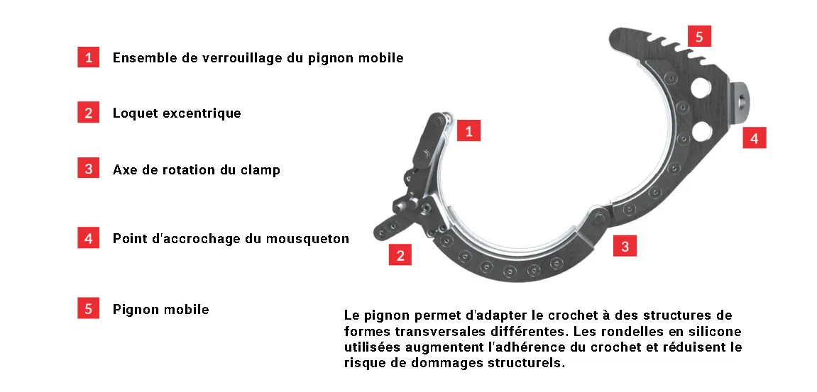 L’orifice d’insertion du câble de raccordement est situé dans une position qui facilite l’insertion du câble de sécurité. Un levier excentrique permet de refermer facilement le crochet sur le profil de la tour de soutien, et un mécanisme de verrouillage à deux niveaux empêche le déverrouillage accidentel de l’unité. Les protections en silicone utilisées améliorent la tenue du crochet.