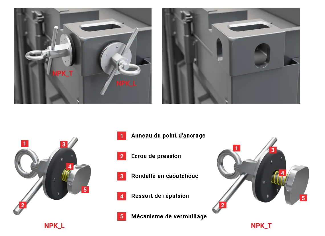 Le dispositif NPK est conçu pour protéger le travailleur pendant le transport et la manutention des conteneurs de transport et de construction.