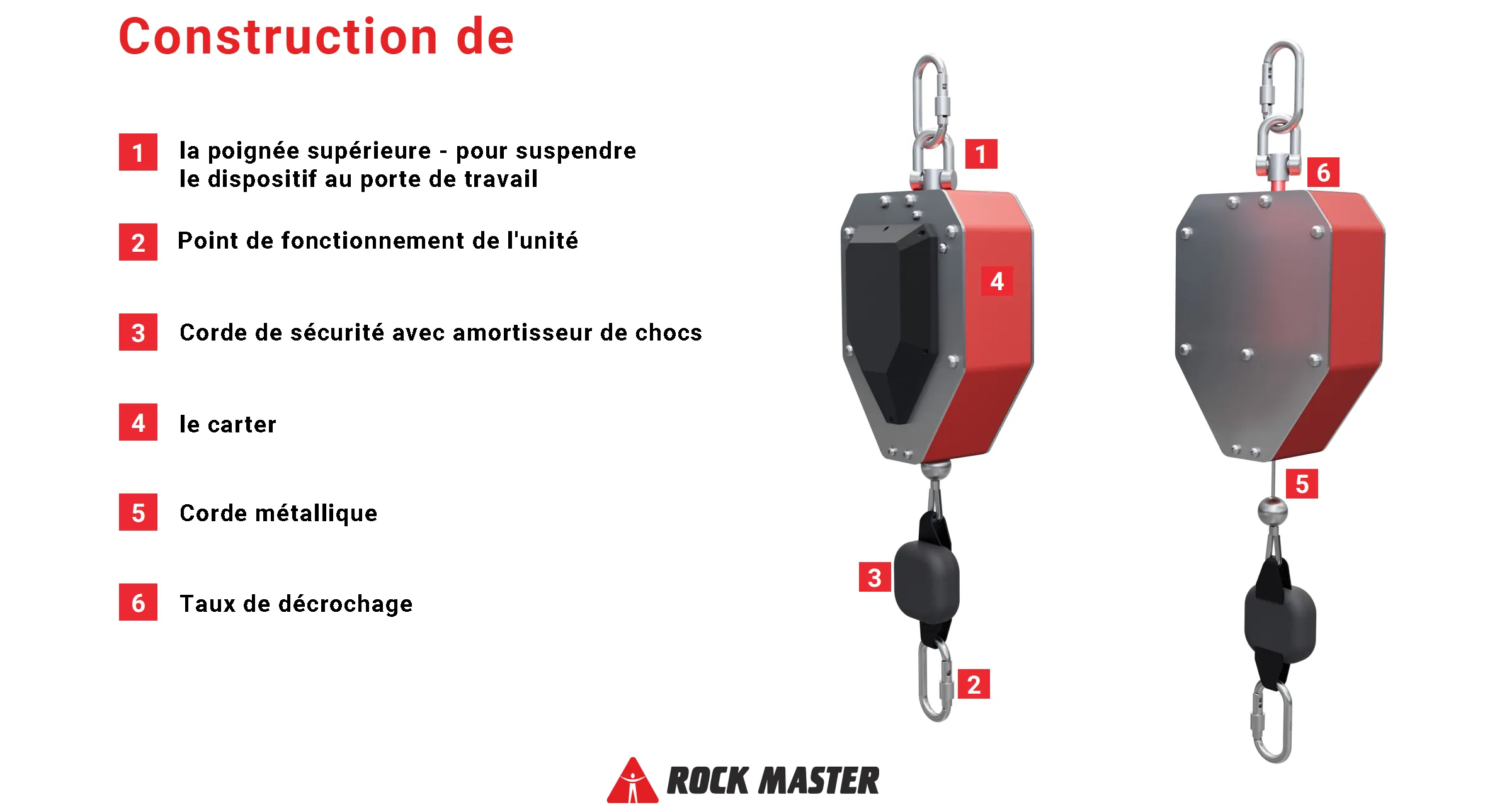 La première est la poignée supérieure, qui sert à suspendre le dispositif au poste de travail (la suspension d’un dispositif autobloquant ne peut être effectuée qu’à l’aide de points d’ancrage de type A ou B conformément à la norme EN 795 : 2012 placés dans la structure/structure du poste de travail à l’aide d’un connecteur conformément à la norme EN362). Le second élément, une corde de sécurité en acier orientée vers le bas et se terminant par un amortisseur avec un connecteur, est le point de fonctionnement du dispositif. Le connecteur est utilisé pour relier la corde au harnais de l’utilisateur.