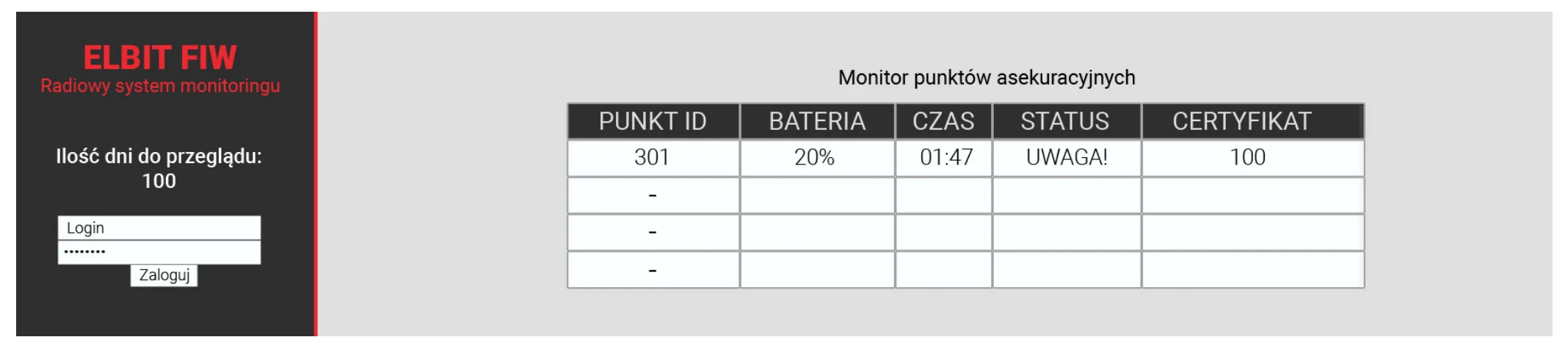Il n’y avait pas non plus d’effet de blindage du signal radio par les composants métalliques du point d’assurage lui-même. Le programme MONITOR est inclus dans le système et permet de vérifier l’état des points d’assurage via une connexion USB. Le logiciel peut être exécuté sous n’importe quel système d’exploitation Windows et ne nécessite aucune condition supplémentaire pour fonctionner correctement. Il s’agit d’un canal supplémentaire, en plus du réseau WiFi, pour alerter le personnel de la survenance d’un accident.