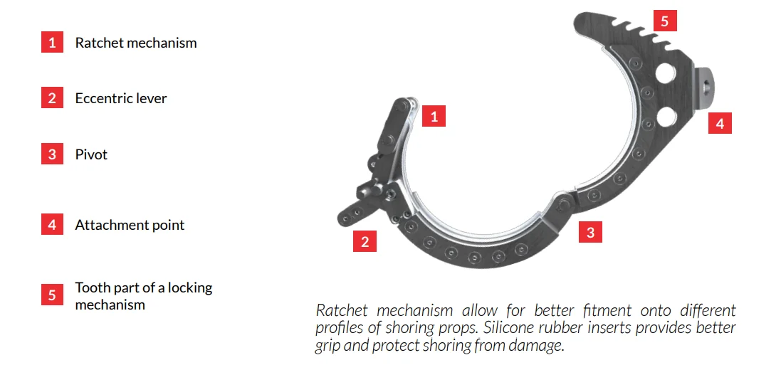 Eccentric lever provides tight fit of the hook onto a shoring prop. Ratchet mechanism requires two, sequential operations to open and dismount a hook, therefore it protects from unintentional dismantling.