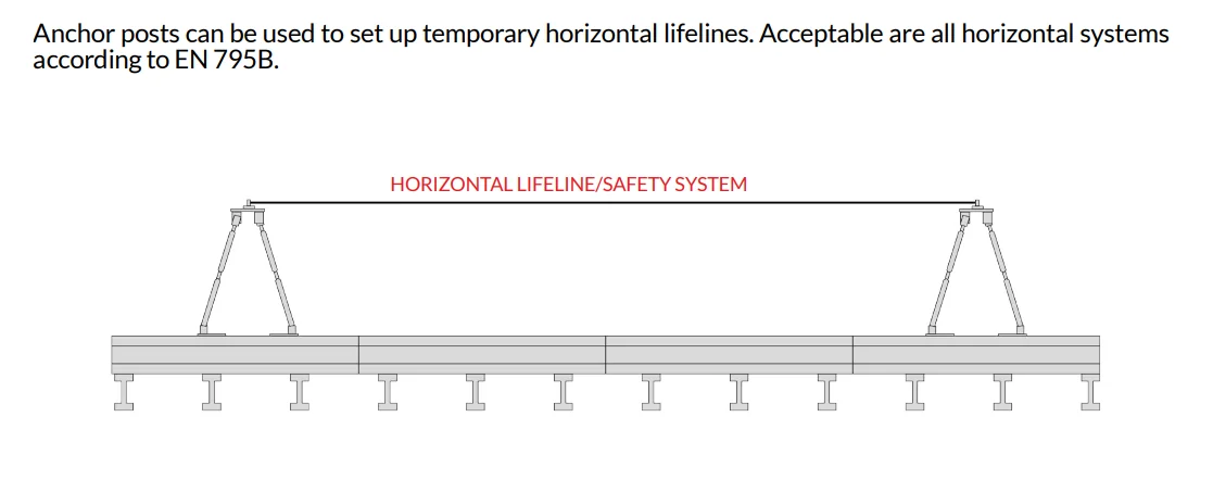 The post can be used standalone (also antipendulum) or as a component in horizontal rope lifeline systems.