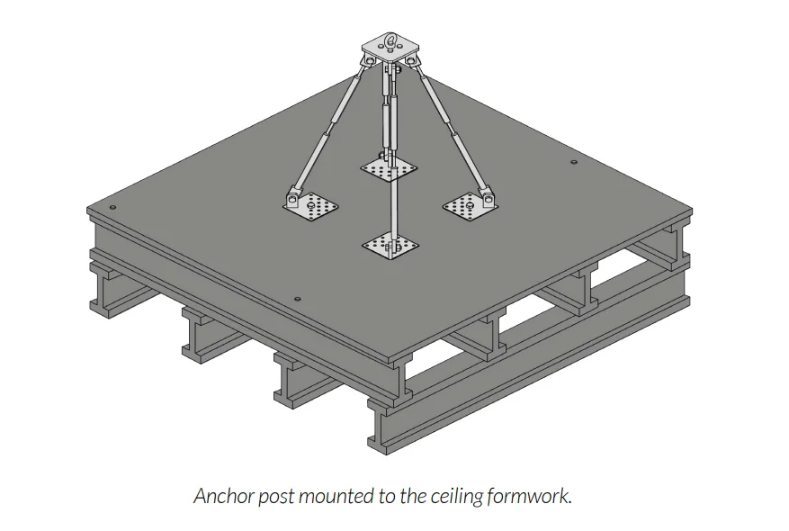 The SQ10 anchor post is designed to be mounted to horizontal formwork boards (wooden) of wooden ceiling formworks. SQ10 meets the requirements of EN 795:2012 type A for the simultaneous use by 2 persons. The unique design of the post also provides an Energy absorbing function to protect the worker and to help avoid damage to the formwork structure.