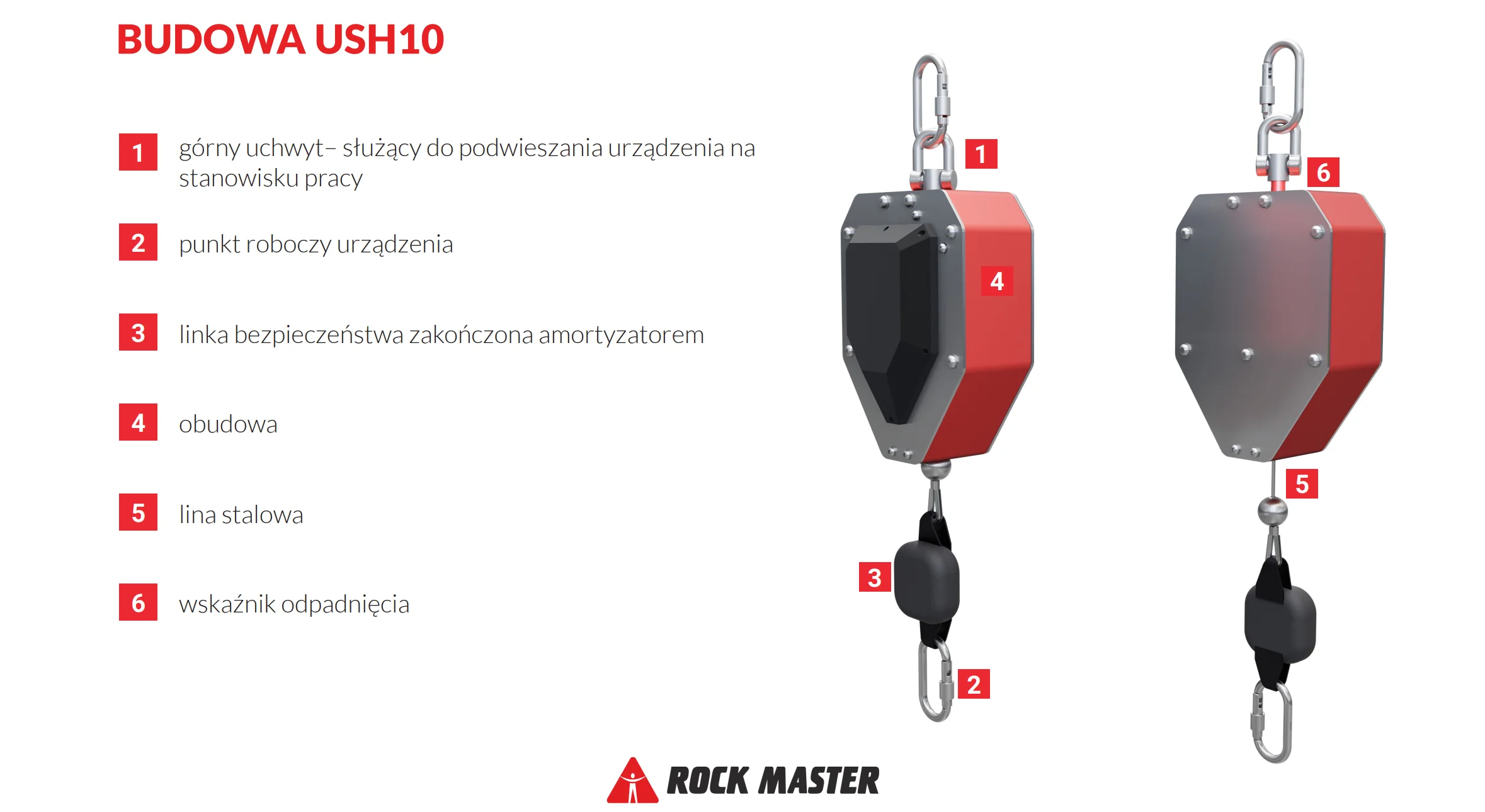 Urządzenie USH opracowane przez CBR Rock Master jest urządzeniem samohamownym spełniającym wymagania normy EN 360:2002. Elementy ruchome stanowiące mechanizm urządzenia samohamownego USH umieszczone są wewnątrz obudowy. Poza obudowę wyprowadzono dwa elementy urządzenia.